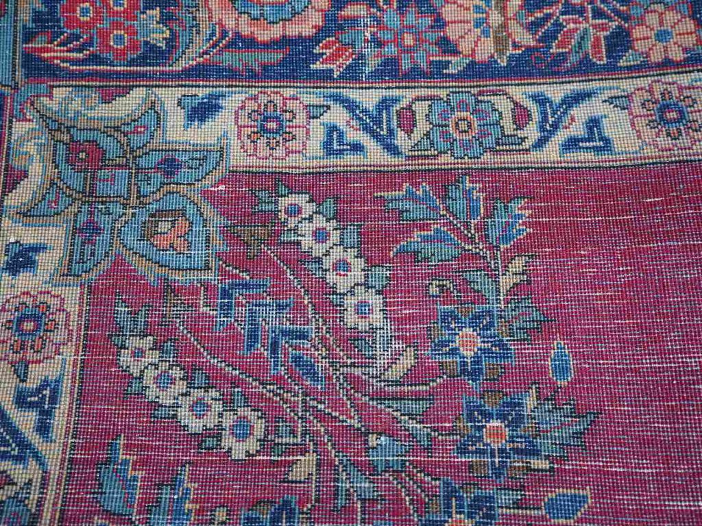 The both-pairs with their accompanying flowers sprays that encircle the dark blue medallion, against the otherwise undecorated wine red field, are down with the precision and detail that such an open field scheme requires. Eight floral vase-sprays of traditional kashan appearance and naturalistic expression cross the entire border composition, and intrude decoratively into the field – a a most successful concept in this instance.The massive light blue palmettos that stand in each corner of the border provide a striking contrast with the dark blue main border of diverse rosettes in a lively and colourful arrangement. White ground minor borders green arabesques linking blue and pink rosettes are an integral part of the carpet’s appearance, with their elegantly-spaced repeat reciprocating the stylistic approach path field.