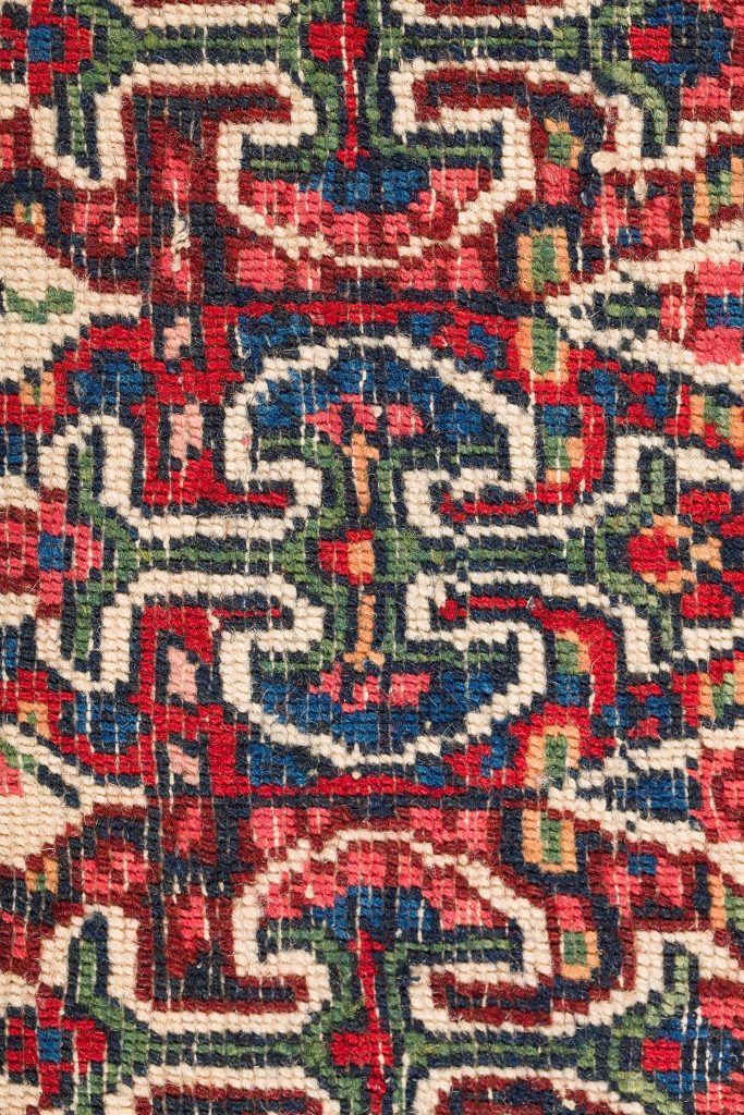 Examples of weavings from Bidjar include small-format rugs as well as long corridor carpets. However, large-format pieces are relatively rare. Rugs from Bidjar are known for their durable construction and strong, raised pile. Weavers in Bidjar used double weft or double knot construction along with a number of implements to create an extremely firm pile using the symmetric Turkish or Ghiordes knot.