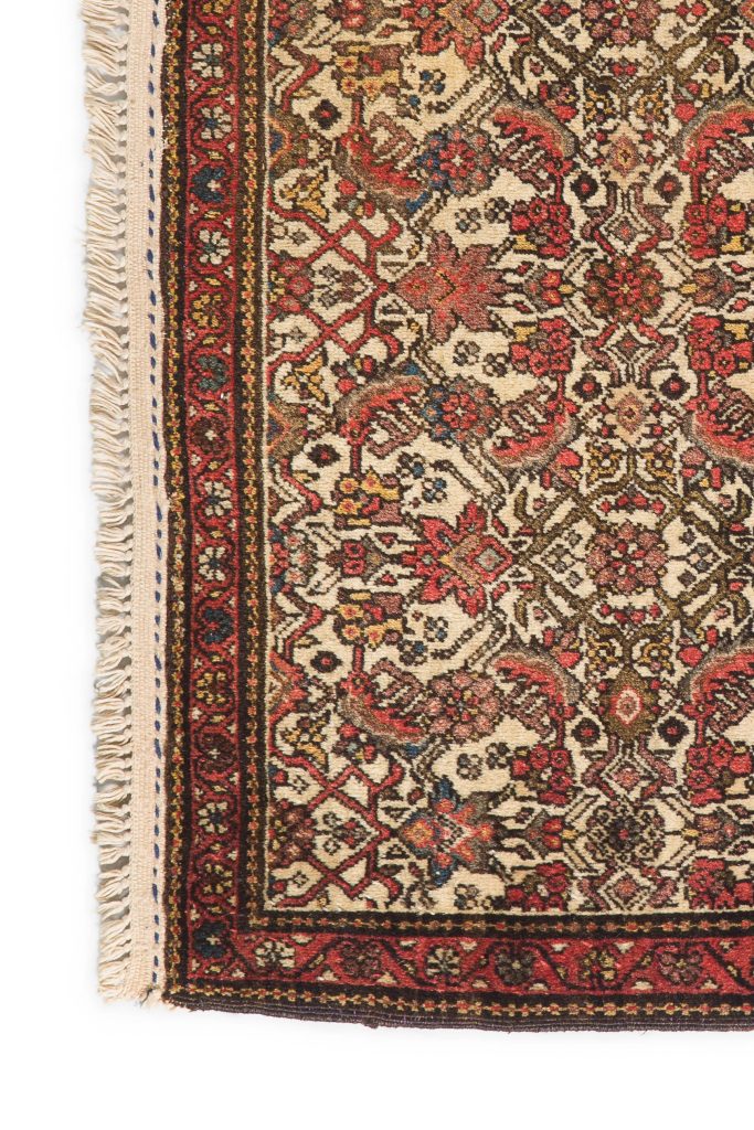 Farahan Sarouk rugs often come close to the angular drawing of Herizes and Serapis, but a much finer scale appropriate to designs of classical derivation. This delicacy of design relates closely to the weaving technique of Farahans, which is relatively tight and fine. The coloration of Sarouk Farahan rugs and carpets tend to be rich yet soft, with emphasis on terracotta reds, delicate blues and greens, and pastel apricots and yellows.
