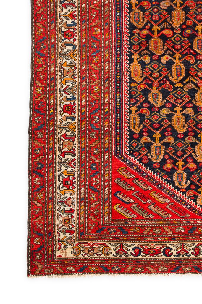 Antique rugs from the Malayer region constitute an important and distinctive group of Persian weavings. Technically they stand between those made in nearby Senneh and Hamadan. They were produced in a range of medallion and allover designs which, although they come from classical Persian sources, tend to be somewhat abstract or geometricized in their rendering. Sometimes Malayer carpet designs can utilize small-scale and fine forms like the Herati pattern, but they can also combine such features with larger composition schemes and the use of open, empty space. Their coloration is generally soft but varied. Malayer rugs have a quiet formality and reserve that makes them excellent decorative pieces for elegant settings.All natural dyes are paramount for the carpet to have more than just decorative value. Beyond that, various dyers had varying levels of skill and invested different lengths of time in dyeing the yarns. The “quality of color”–its radiance and level of nuance within each color–is centrally important. Certain rare colors such as Tyrian purple, saffron yellow, cochineal rose and greens add to the carpet’s value