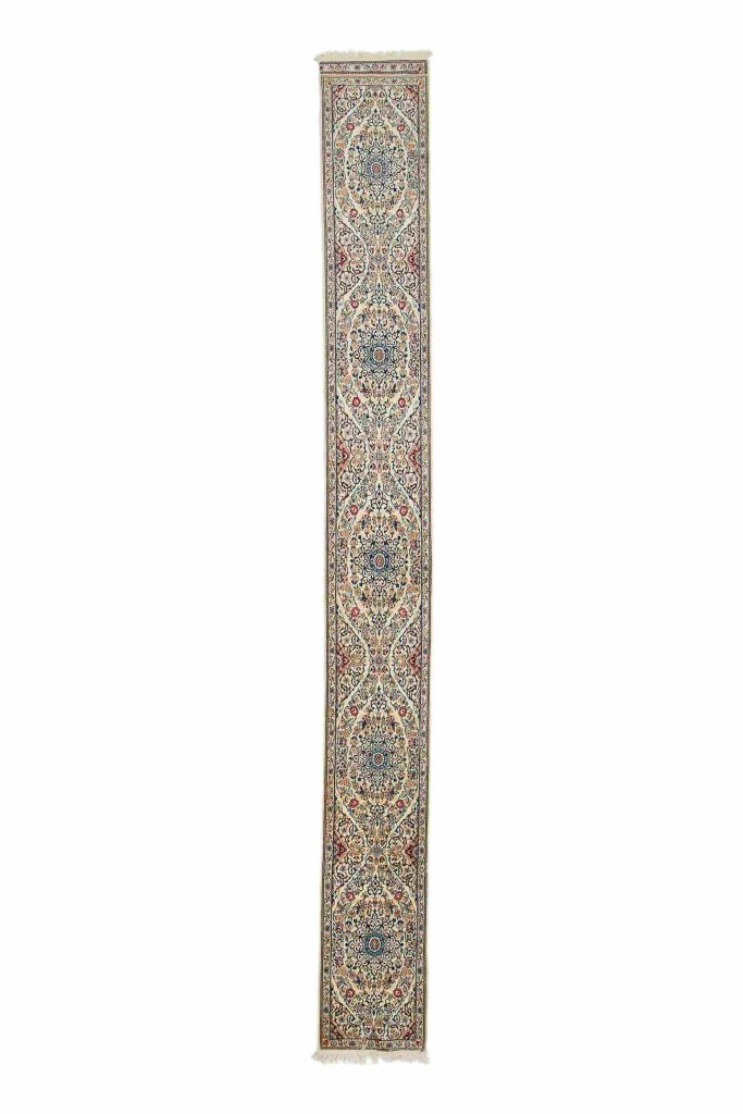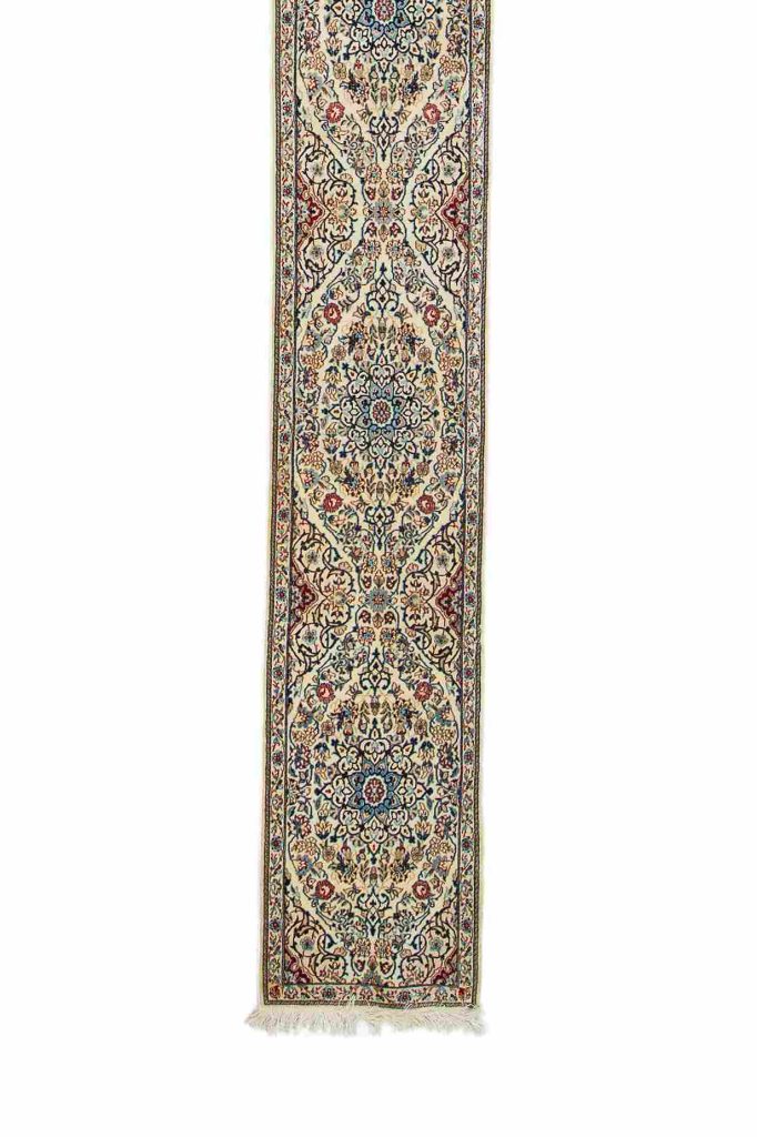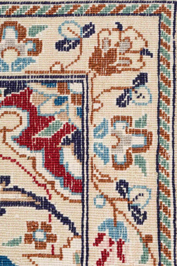 The standard used to determine the quality of a Nain rug is the measurement of LAA, the number of threads forming each fringe at the end of the rug. They are exquisitely woven with the Persian knot, with an average of 300 knots per square inch. The higher the knots per square inch and the lower the LAA, the higher the quality and the price of a Nain rug is.
