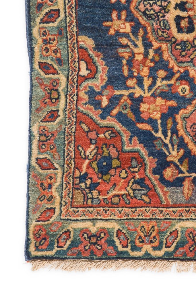 Antique carpets produced in Sarouk feature classic curvilinear vinescrolls and opulent arabesques as well as local bouquet-filled designs that represent the diversity of regional carpet-weaving traditions. The carpets of Sarouk are traditionally made with blue weft threads. However, the surface designs and floriferous patterns incorporate a tremendous variety of pure and clear colors. The village of Saruk produces stunning medallion-and-corner rugs and exquisite allover Herati patterns, but the lush carpets that feature beautifully isolated bouquets and shrubs best represent the unique aesthetic of Sarouk. Whatever design they feature, Persian Sarouk carpets have an opulent and enduring aesthetic that will always be in demand.