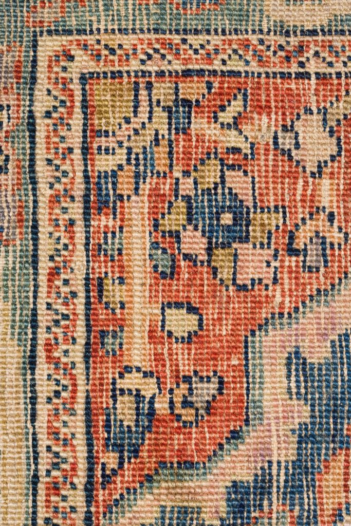 All natural dyes are paramount for the carpet to have more than just decorative value. Beyond that, various dyers had varying levels of skill and invested different lengths of time in dyeing the yarns.  The “quality of color”–its radiance and level of nuance within each color–is centrally important.  Certain rare colors such as Tyrian purple, saffron yellow, cochineal rose and greens add to the carpet’s value