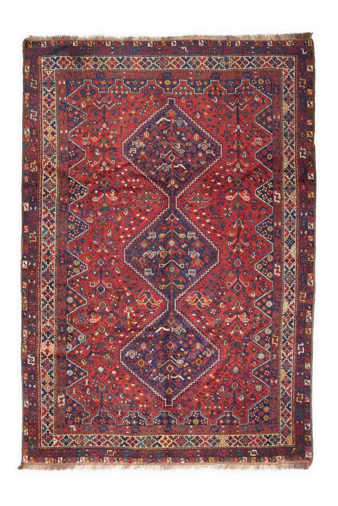 Designs in the fields of these rugs feature many different images. Medallions, geometric shapes, and abstract patterns are common, but so are recognizable objects. The Qashqai people did not write down their history or stories, but would often weave them into their rugs. The antique Persian Qashqai rugs are said to tell tales and record their daily lives. They frequently depict people and animals, but also common household objects, including combs, trees, flowers, and possessions.