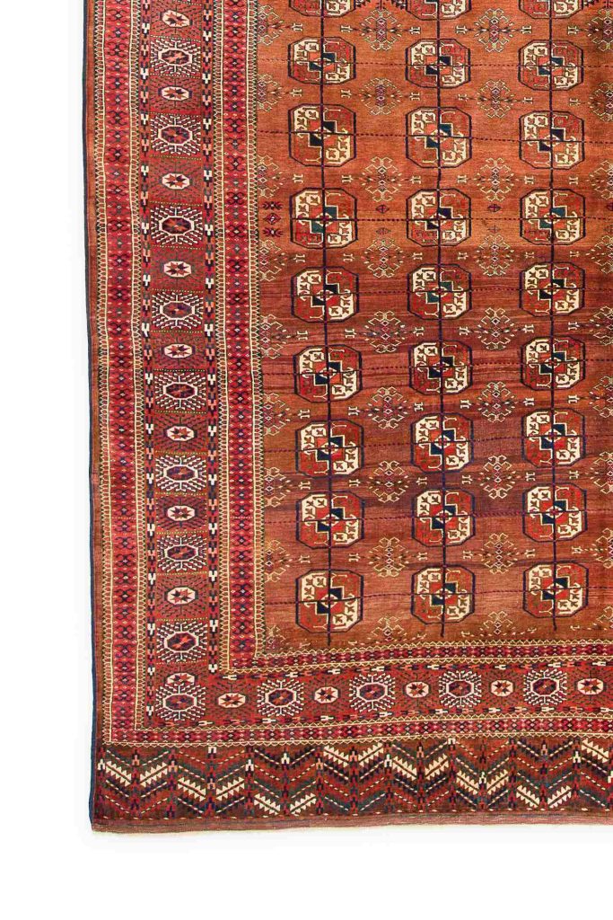 Typically, the design of a traditional, representative Tekke rugs will include the Gurbaghe Gul somewhere in the field. The main border of traditional tribal Tekke rugs would usually be woven with a red background that includes octagons and eight-pointed stars. The tonal range centers around warm hues, such as reds, purples and browns. Antique Tekke rugs and carpets are admired for their great tribal and cultural verisimilitude, which is evidenced by their distinctly tribal compositions. Unique carpets, Tekke rugs offer interested parties an unparalleled opportunity to own an authentic piece of tribal art.All natural dyes are paramount for the carpet to have more than just decorative value. Beyond that, various dyers had varying levels of skill and invested different lengths of time in dyeing the yarns.  The “quality of color”–its radiance and level of nuance within each color–is centrally important.  Certain rare colors such as Tyrian purple, saffron yellow, cochineal rose and greens add to the carpet’s value